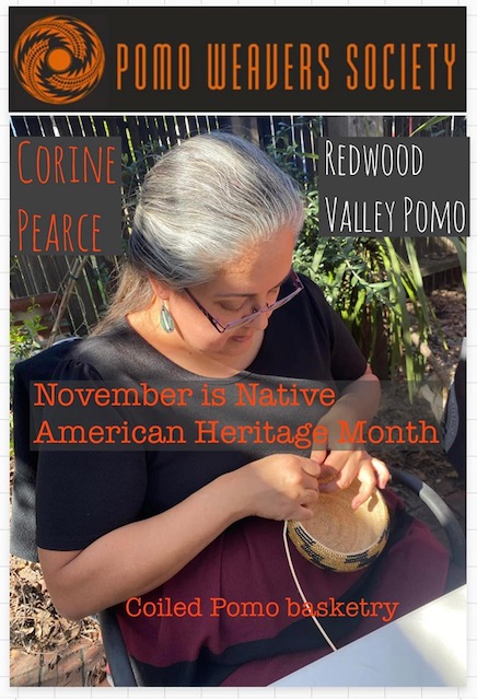 November is Native American Cultural Awareness Month, which is the perfect time for the Corner Gallery to feature the Pomo Weavers Society in their front windows. Silver Galleto, the founding member of the group, was very excited to have this opportunity for outreach with the public. He wanted to let people know that Pomo weavers are active and trying to reestablish many of their traditions, especially basket making, that haven’t been fully practiced for decades.