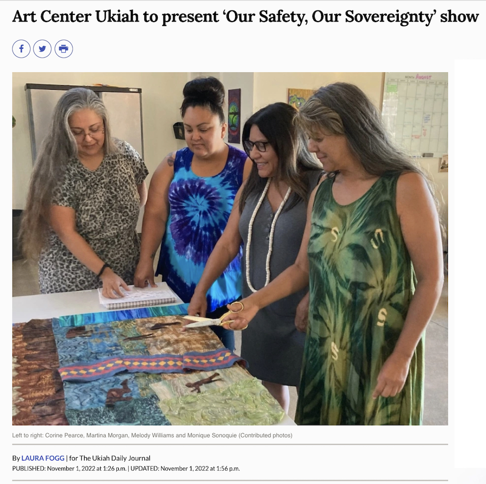 The “Our Safety Our Sovereignty” show, featuring a number of Native artists and curated by Corine and held at the Art Center Ukiah/Corner Gallery in November 2022, will be traveling to Middletown Arts Center in April-June 2023.